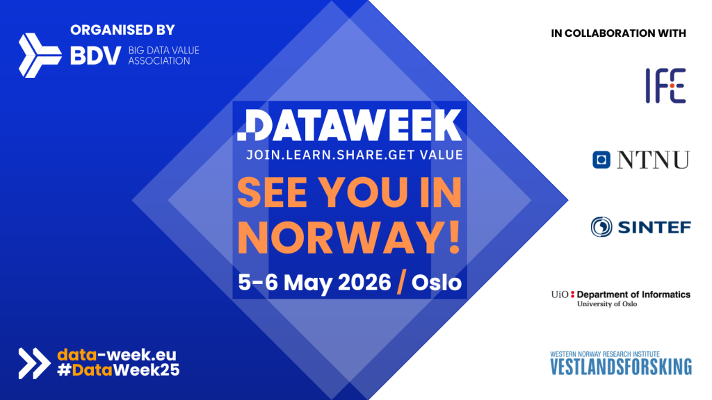 Data Week 2026 will take place between 5-6 May 2026 in the capital of Norway, Oslo. Data Week is the spring gathering of the Data and AI research and innovation community. In Data Week, the participants share knowledge and results, discuss topics of common interest, find synergies, build new collaborations and identify new challenges and recommendations. Data Week also links the communities and their results to the European policies and market needs and brings European initiatives and activities closer to local communities.